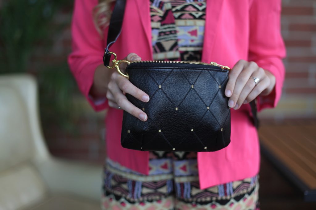 Odette Mini Bag from Daylin Skye Designs ($88 – use code GEMBENEFITS40 for 40% OFF!!), Pink Blazer (similar from Nordstrom – $74), Romper (similar from Shoptiques – $60), Recycled Guitar String Earrings from Restrung Jewelry ($38)
